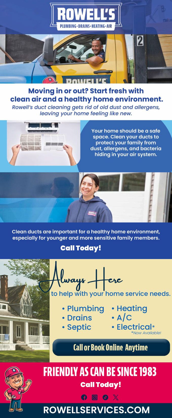 "Friendly As Can Be Since 1983!" When you need help with your plumbing, drains, heating, cooling or electrical in Concord, you can always rely on Rowell's Services! Call us now or book online!