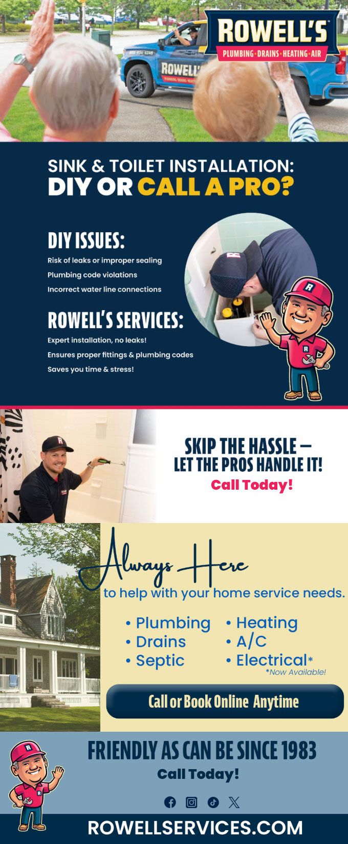 "Friendly As Can Be Since 1983!" When you need help with your plumbing, drains, heating, cooling or electrical in Concord, you can always rely on Rowell's Services! Call us now or book online!